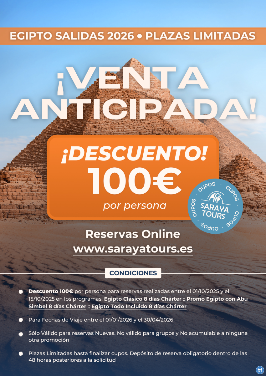 ¡¡¡Venta Anticipada EGIPTO!!! Descuento 100 € p.persona. Salidas 01/01/26 al 30/04/26. Consultar condiciones.