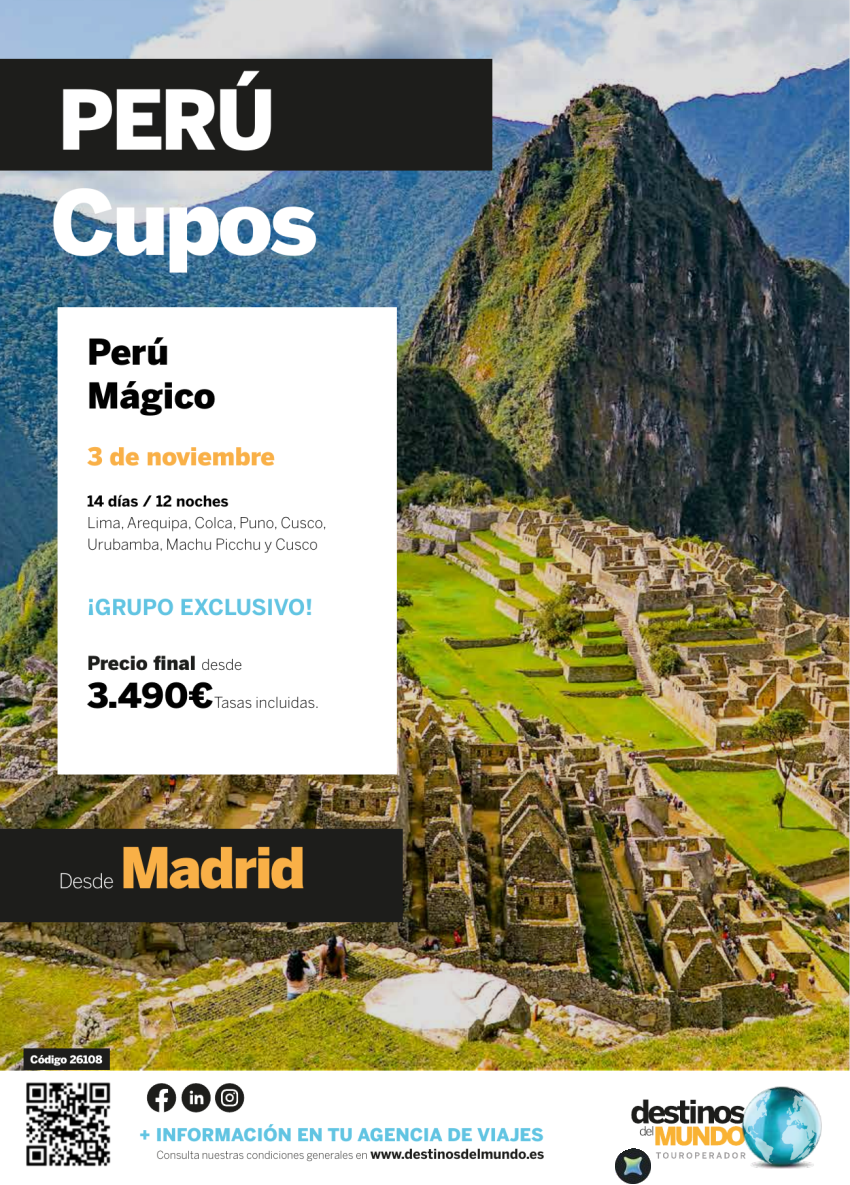 🇵🇪 🦙Perú mágico CUPOS 14 días / 12 noches origen: Madrid salidas: 03 de noviembre del 2026 desde 3.490€🇵🇪